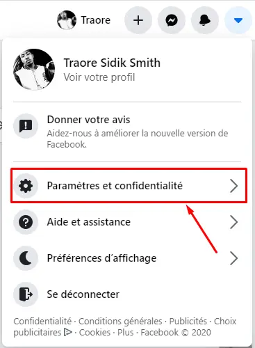 - Ensuite cliquer sur le triangle qui se trouve en haut à droite de votre écran. Veuillez cliquer sur ” paramètres et confidentialité “.