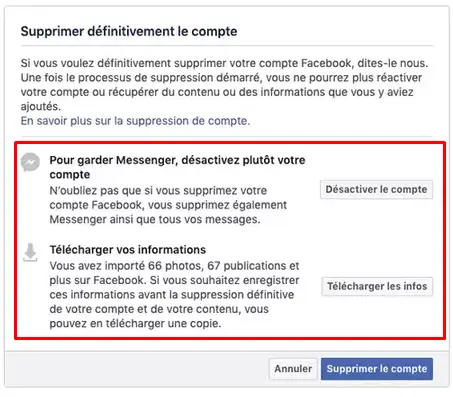 - La suppression du compte Facebook entraîne immédiatement la suppression de vos photos, vidéos, publications. Vous n’aurez plus la possibilité d’envoyer des messages sur Messenger. Aussi, vous ne pourrez plus réactiver votre compte.